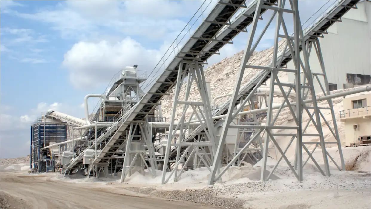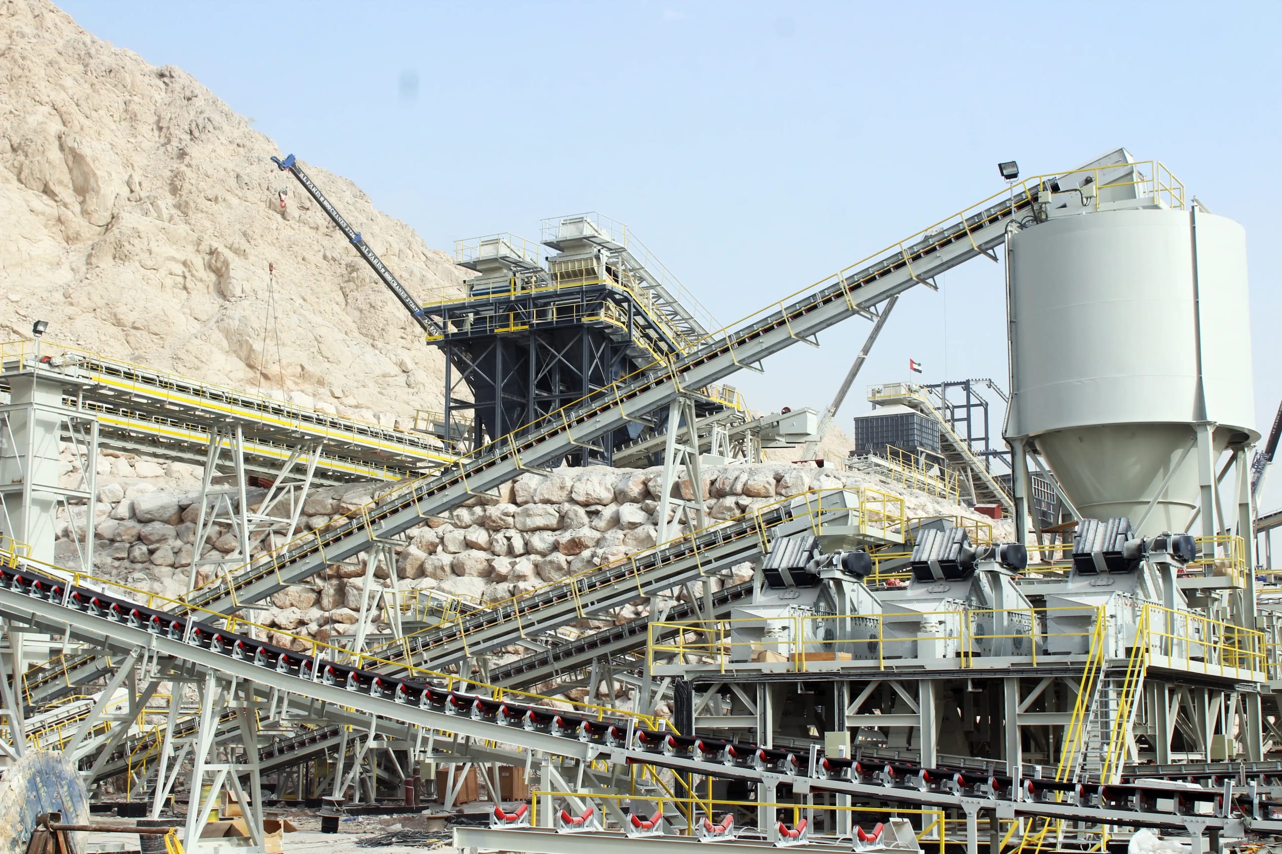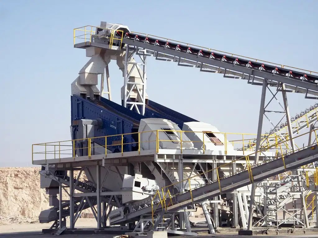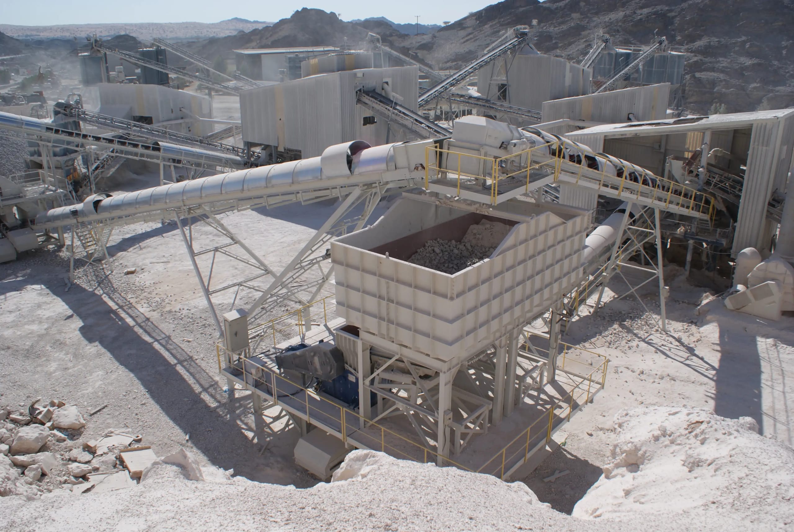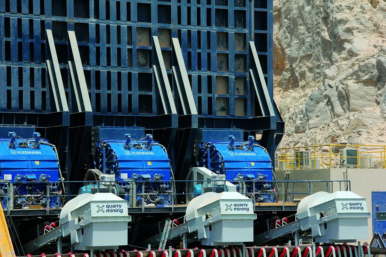 Description: Crushing & Screening plant Designed by QM for feed of 3500 t/h limestone 0-400mm to produce 2800 t/h of 0-5/5-10/10-20/20-32mm. Existing of 2 Grizzly screens, 11 screens, chute work, silos, 6 KLEEMANN impact crushers and about 60 conveyors with STIEBEL GearMotors. Steel Structure, chute work and Conveyors been engineered , manufactured and installed by QM.