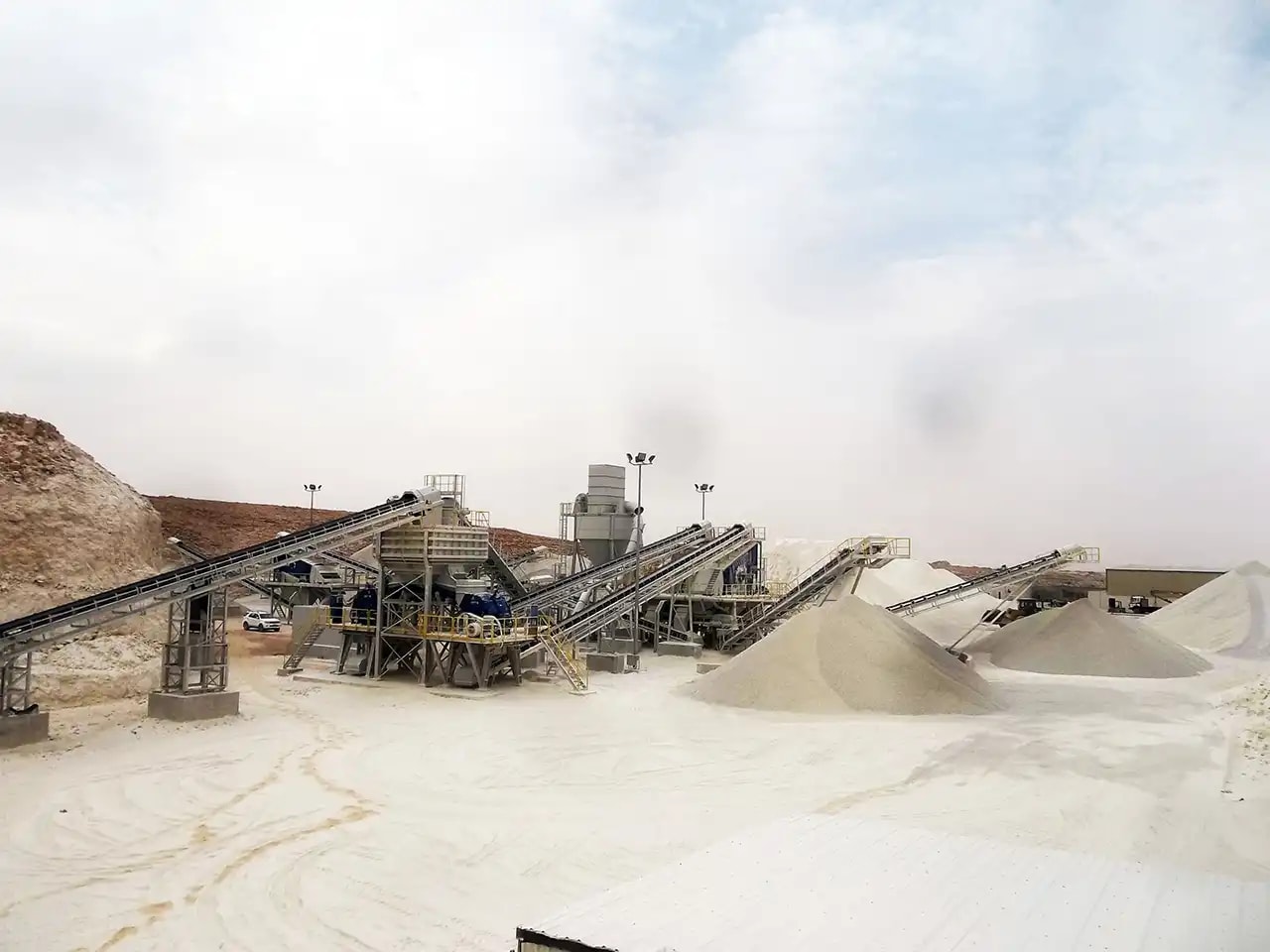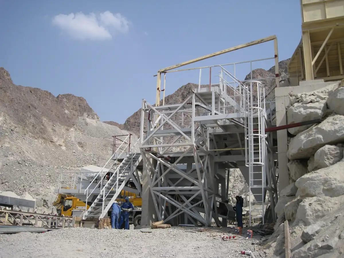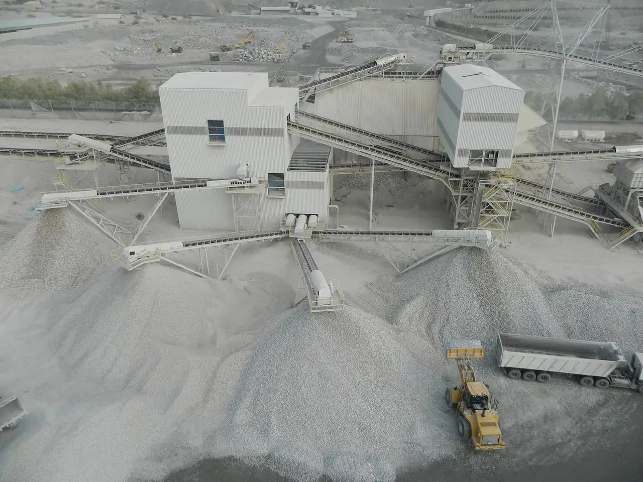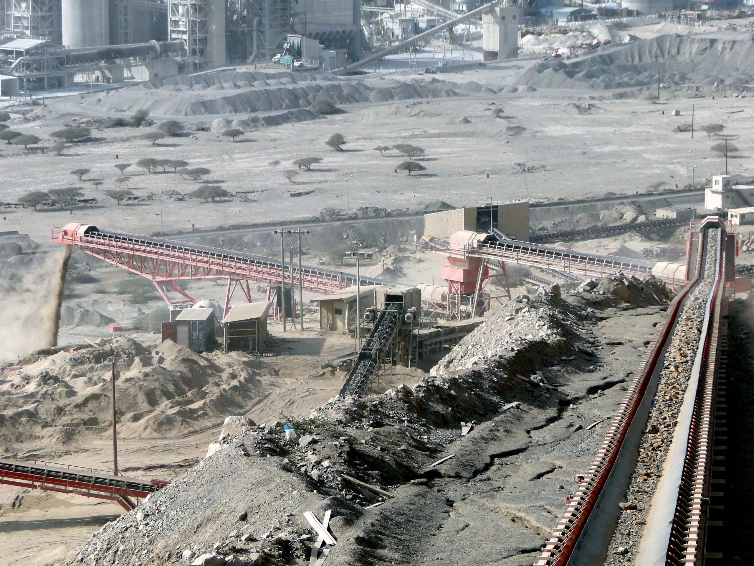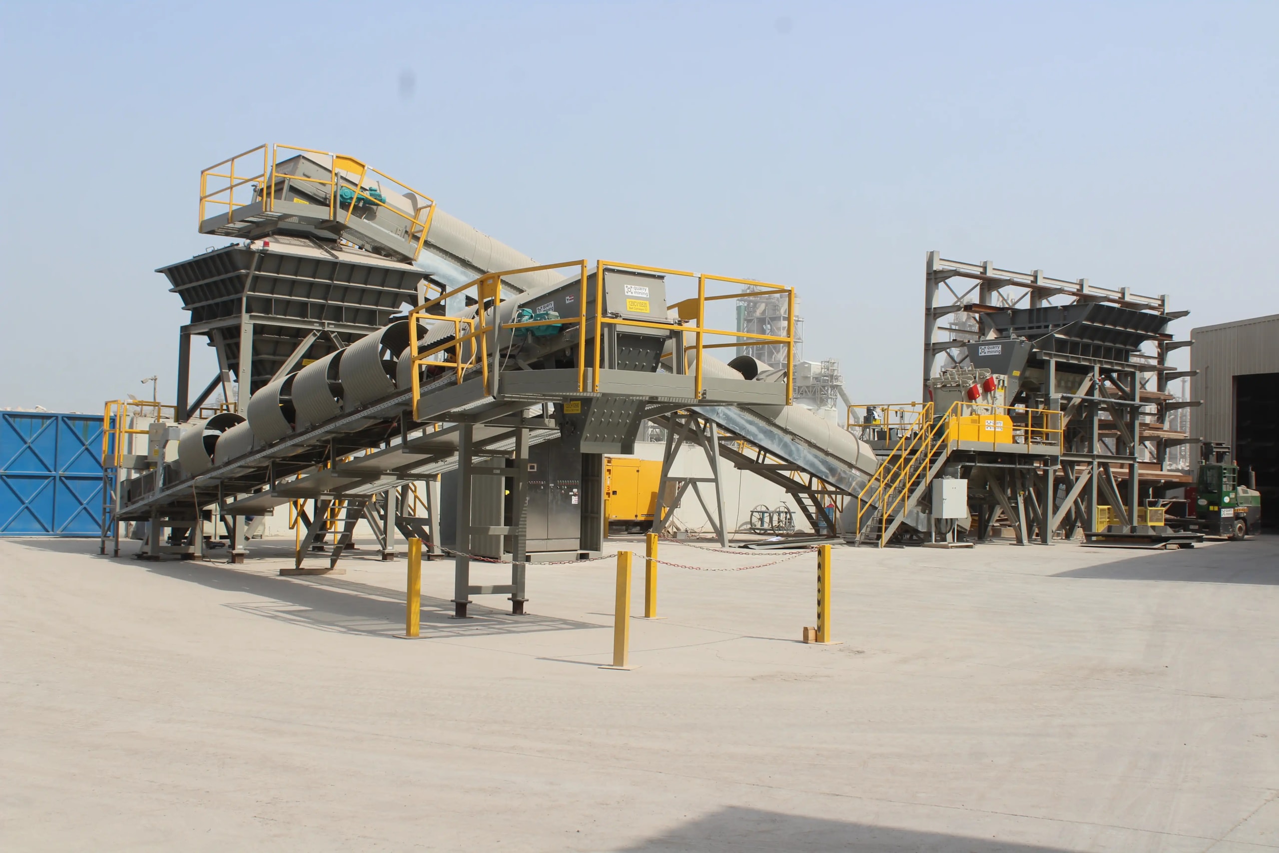 Description: Crushing & Screening plant Designed by QM for feed of 3500 t/h limestone 0-400mm to produce 2800 t/h of 0-5/5-10/10-20/20-32mm. Existing of 2 Grizzly screens, 11 screens, chute work, silos, 6 KLEEMANN impact crushers and about 60 conveyors with STIEBEL GearMotors. Steel Structure, chute work and Conveyors been engineered , manufactured and installed by QM.