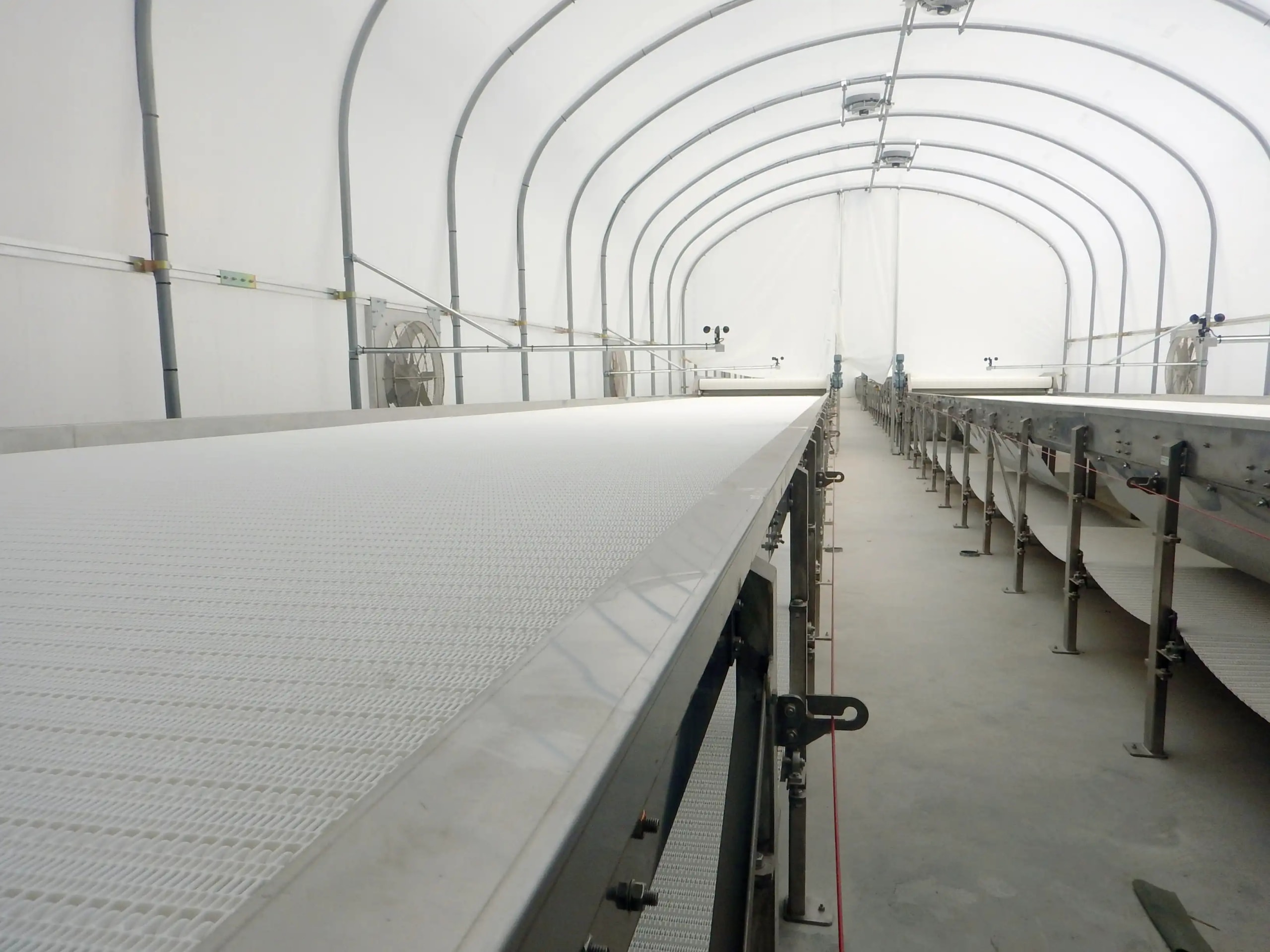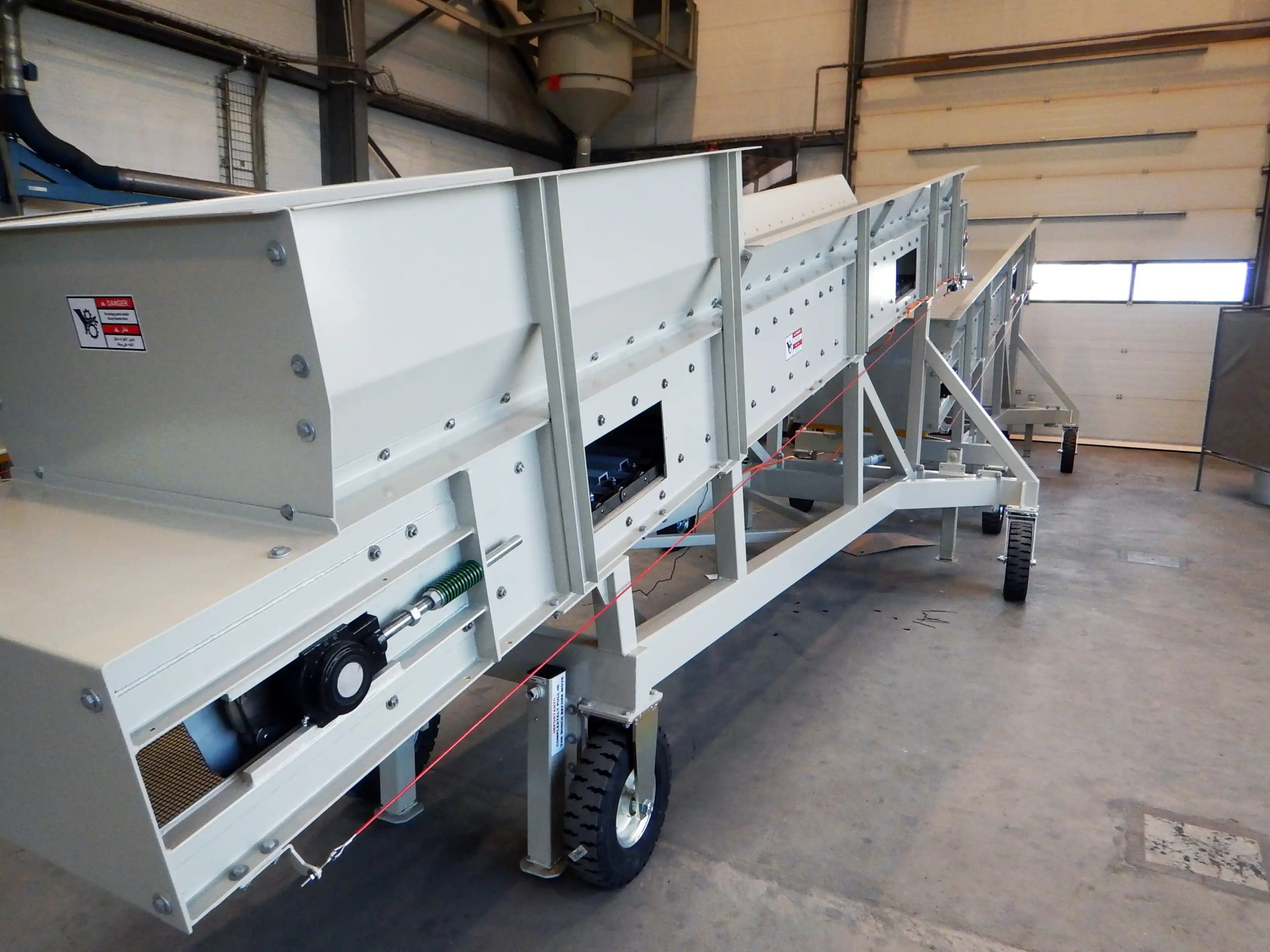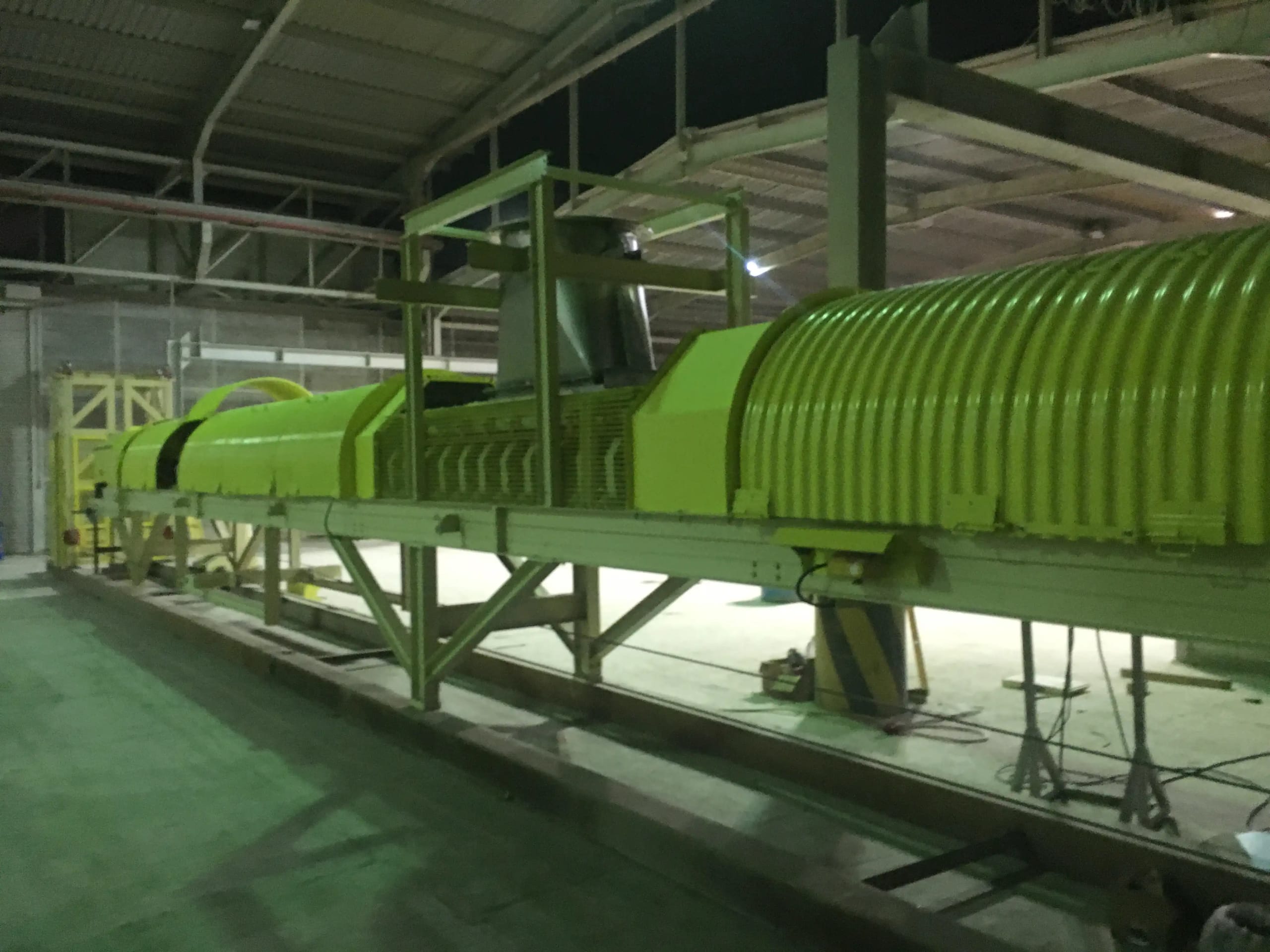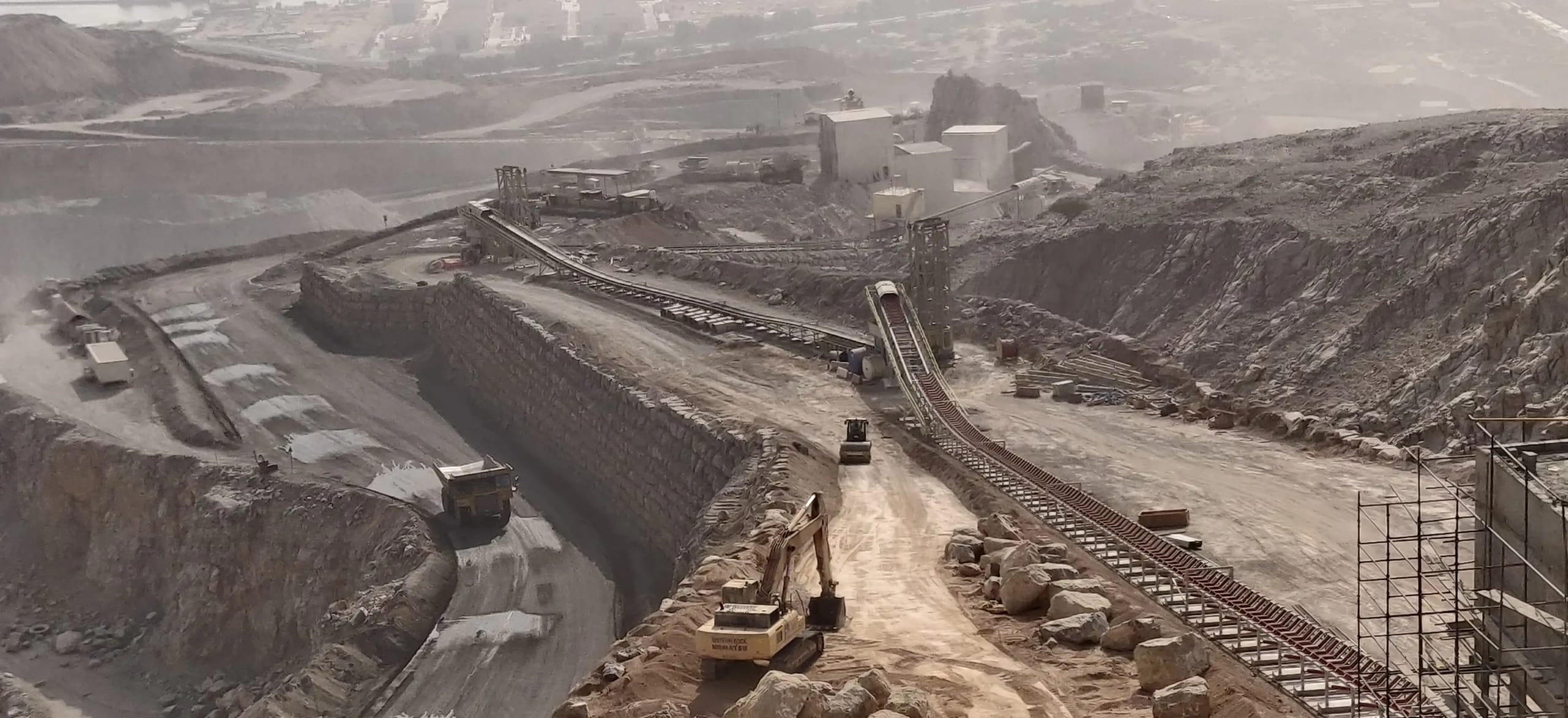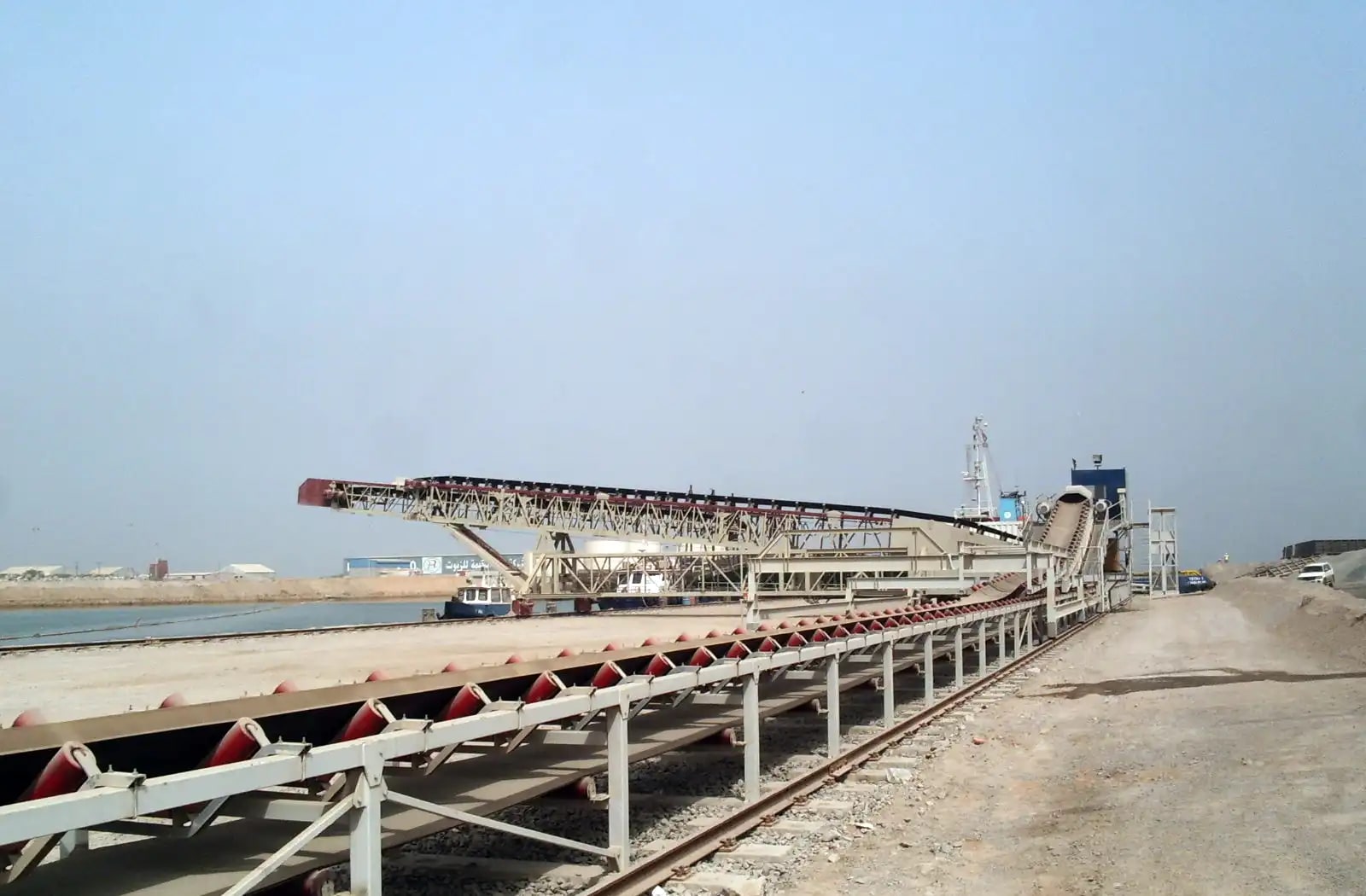 Description: 1400 meter downhill land conveyor with 3000/3300 t/h capacity for pre crushed lime stone. All gearmotors are from STIEBEL Germany. Complete system with PLC controls been designed by QM Engineering Department. Belt will be slowed down through frequency control system, to adjust speed. The potential energy is utilized while the conveyor belts are breaking regeneratively and the energy gained is fed back into the power grid. Total installation power for conveyor system = 2,200 KW